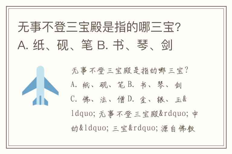 无事不登三宝殿是指的哪三宝? A. 纸、砚、笔 B. 书、琴、剑 C. 佛、法、僧 D. 金、银、玉