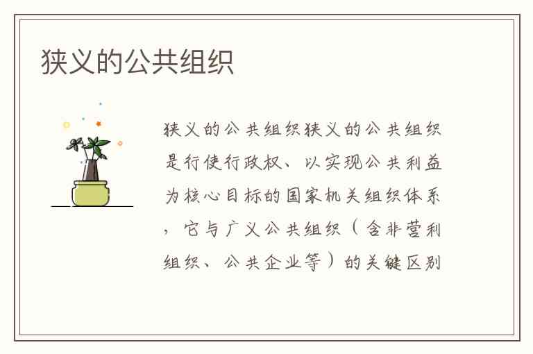 狭义的公共组织是行使行政权、以实现公共利益为核心目标的国家机关组织体系,它与广义公共组织(含非营利组织、公共企业等)的关键区别在于直接掌握法定公共权力并具有强制性管理职能。这类组织不仅包括政府行政部门,还涵盖立法、司法等国家权力机构,其本质是通过制度化的权力运行维护社会公共秩序并提供公共服务。