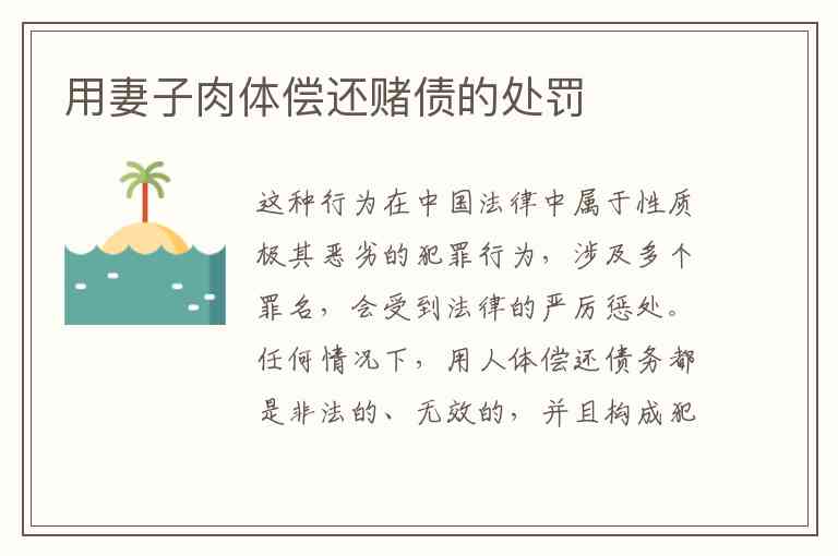 用妻子肉体偿还赌债,绝不是简单的“私事”或“道德问题”,而是严重的刑事犯罪。丈夫和债权人都将作为犯罪嫌疑人被追究刑事责任。法律绝不会容忍这种严重侵犯妇女人身权利和尊严的暴行。