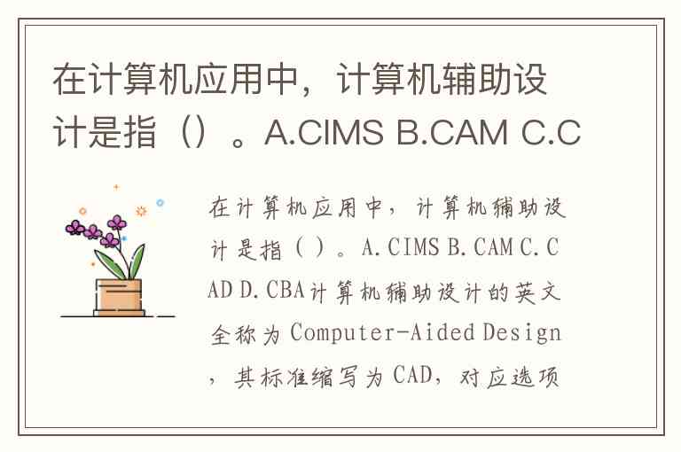 在计算机应用中,计算机辅助设计是指()。A.CIMS B.CAM C.CAD D.CBA