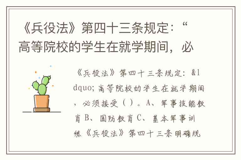 《兵役法》第四十三条规定:“高等院校的学生在就学期间,必须接受()。A、军事技能教育 B、国防教育 C、基本军事训练