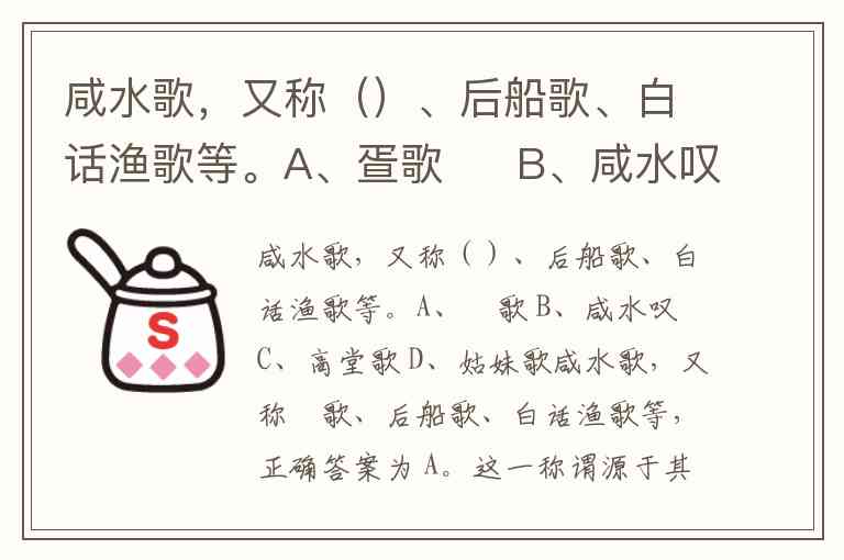 咸水歌,又称疍歌、后船歌、白话渔歌等,正确答案为 A。这一称谓源于其核心传承群体——疍家人,他们是世代生活在东南沿海的水上居民,咸水歌正是他们用方言创作并传唱的民歌形式。作为疍家文化的“活化石”,咸水歌不仅是渔民劳作时的即兴演唱(如捕鱼、晒网时),也是节庆、婚丧等场合的情感表达载体,被称为疍家人的“《诗经》”。