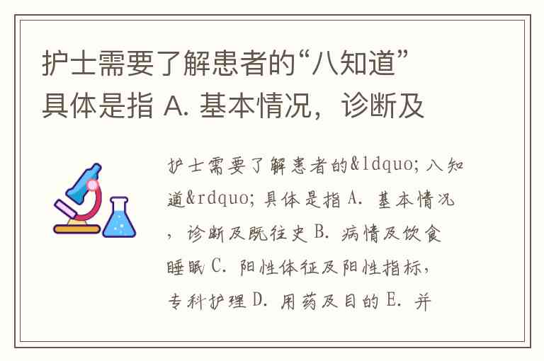 护士需要了解患者的“八知道”具体是指 A. 基本情况,诊断及既往史 B. 病情及饮食睡眠 C. 阳性体征及阳性指标,专科护理 D. 用药及目的 E. 并发症预防及康复计划