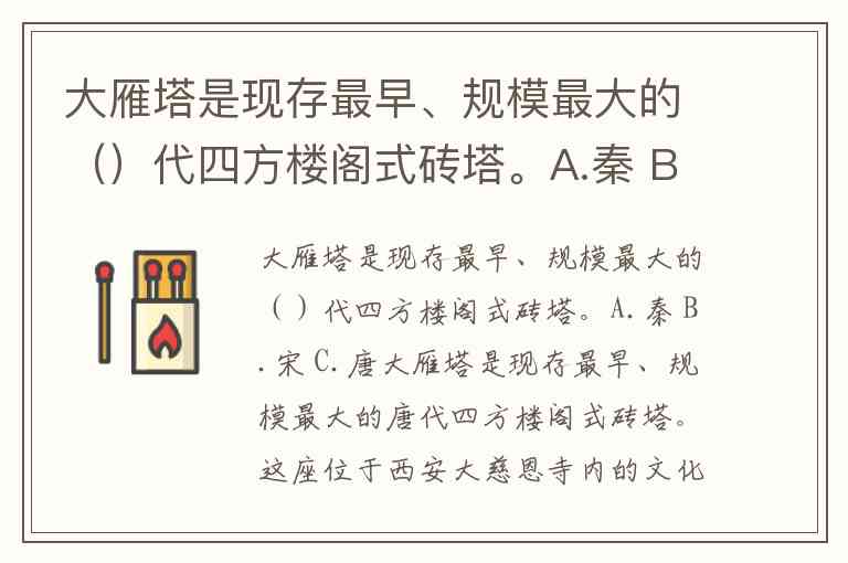 大雁塔是现存最早、规模最大的()代四方楼阁式砖塔。A.秦 B.宋 C.唐