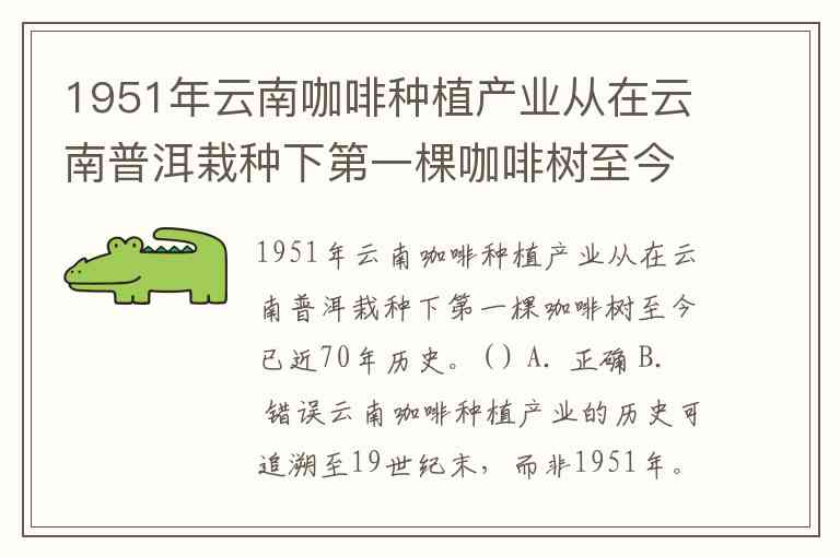 1951年云南咖啡种植产业从在云南普洱栽种下第一棵咖啡树至今已近70年历史。( ) A. 正确 B. 错误
