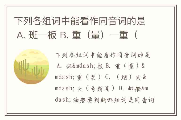 下列各组词中能看作同音词的是 A. 班—板 B. 重(量)—重(复) C. (烟)头 —头(号新闻) D. 邮船—油船