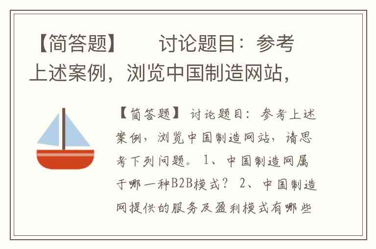 【简答题】 讨论题目:参考上述案例,浏览中国制造网站,请思考下列问题。 1、中国制造网属于哪一种B2B模式? 2、中国制造网提供的服务及盈利模式有哪些? 3、你认为中国制造网的商业模式还有哪些需要改进之处A.3 B.5 C.2 D.4