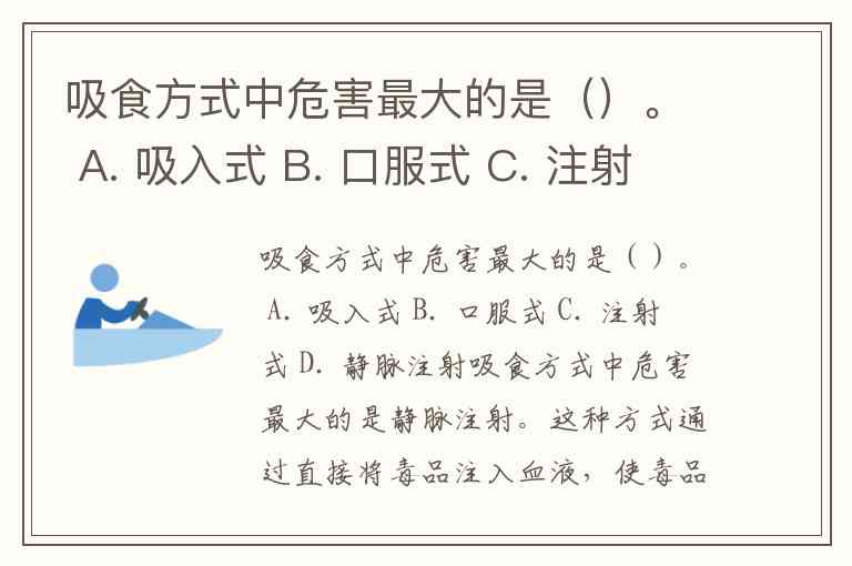 吸食方式中危害最大的是()。 A. 吸入式 B. 口服式 C. 注射式 D. 静脉注射