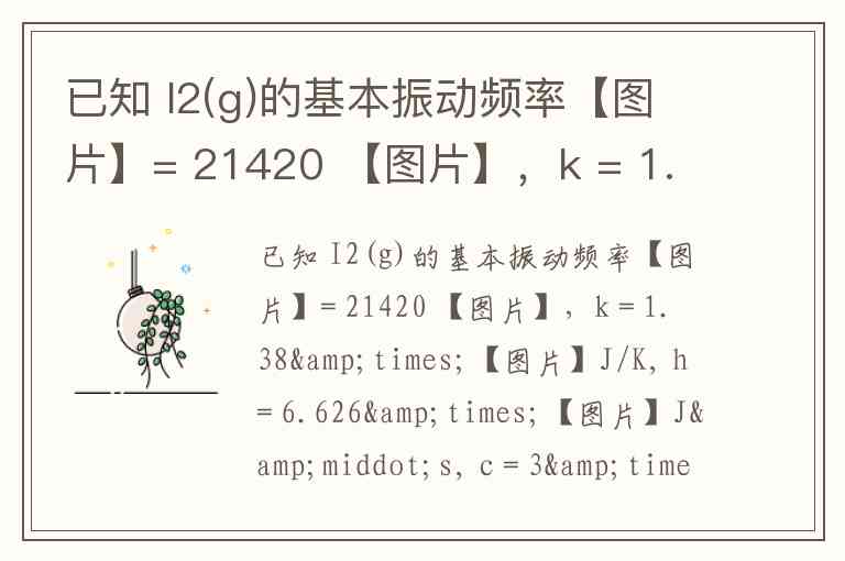 要计算I₂(g)的振动特征温度Θᵥ,需使用公式Θᵥ = hν/k,其中ν为分子振动频率,h为普朗克常数,k为玻尔兹曼常数。题目中“基本振动频率”的单位应为光谱学常用的波数(cm⁻¹),需先将波数转换为频率ν,再代入公式计算。