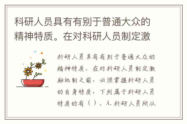 科研人员具有有别于普通大众的精神特质。在对科研人员制定激励机制之前,必须掌握科研人员的自身特质,下列属于科研人员特质的有()。A.科研人员所从事的工作具有极大不确定性 B.需求层次具有多样性,渴望取得成就与自我价值实现 C.具有较强的工作自主性需求坚守独立的思想和价值观 D.热衷于创新具有强烈的求知欲和对自身能力发展的需求