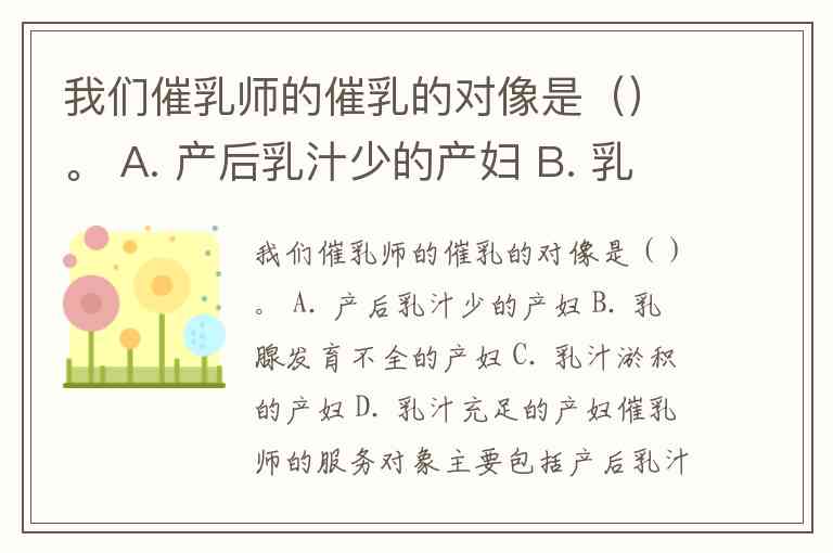 催乳师的服务对象主要包括产后乳汁分泌异常或哺乳困难的产妇。根据专业定义,催乳师通过按摩、饮食指导和心理疏导等方式,帮助解决无乳、泌乳少、乳汁淤积等问题,服务对象需满足“乳房生理结构正常且身体健康”的前提条件。