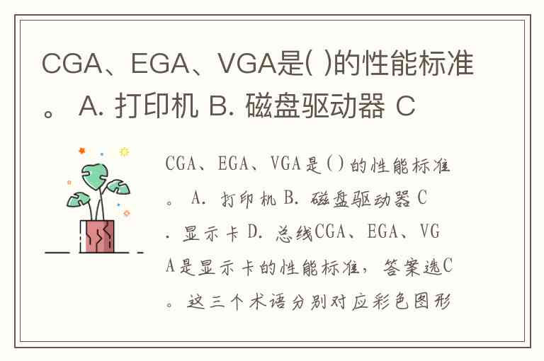 CGA、EGA、VGA是( )的性能标准。 A. 打印机 B. 磁盘驱动器 C. 显示卡 D. 总线