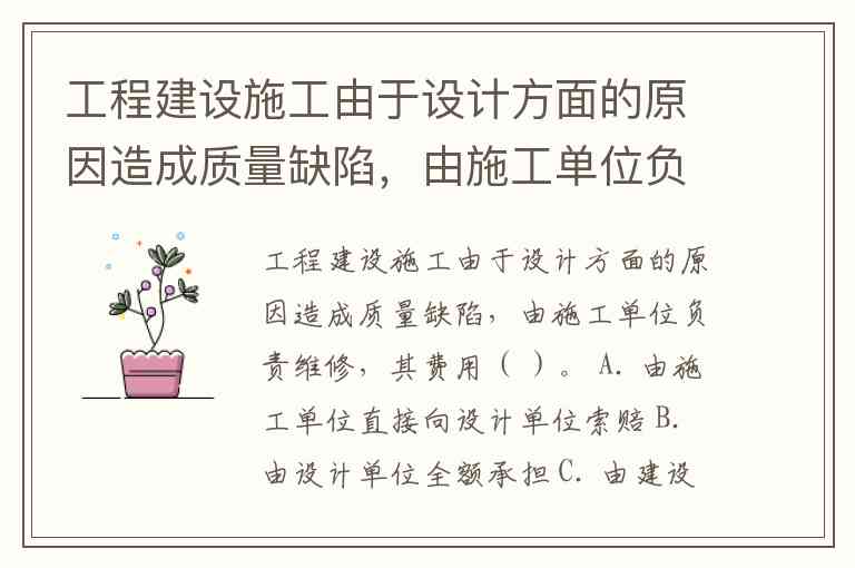 工程建设施工由于设计方面的原因造成质量缺陷,由施工单位负责维修,其费用( )。 A. 由施工单位直接向设计单位索赔 B. 由设计单位全额承担 C. 由建设单位全额承担 D. 通过建设单位向设计单位索赔,不足部分由建设单位负责