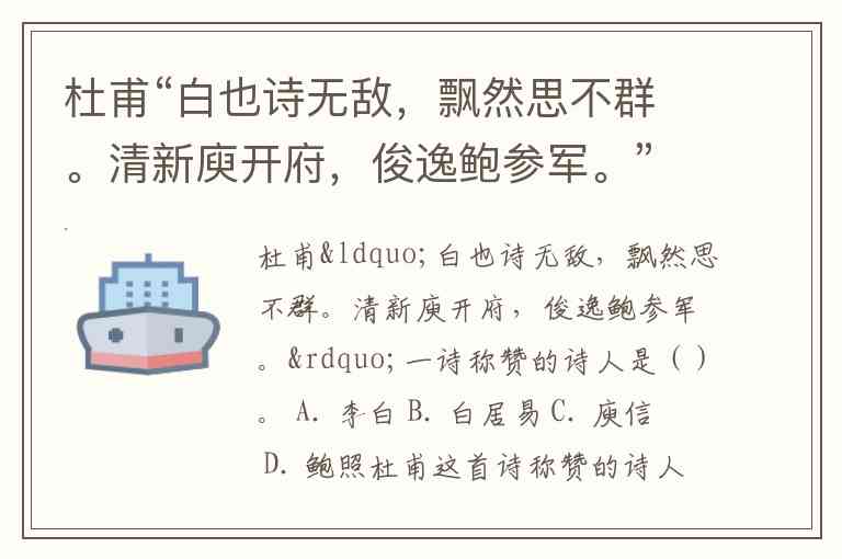 杜甫“白也诗无敌,飘然思不群。清新庾开府,俊逸鲍参军。”一诗称赞的诗人是()。 A. 李白 B. 白居易 C. 庾信 D. 鲍照