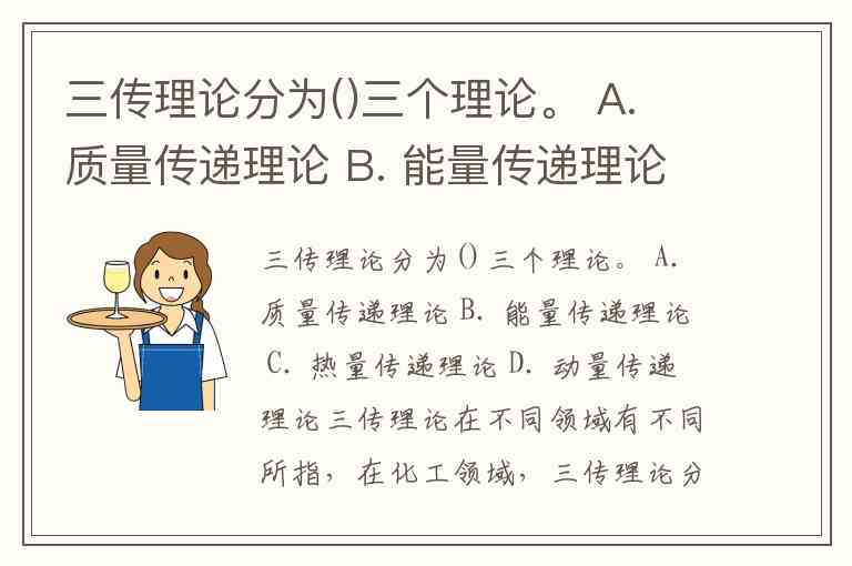 综上,本题正确答案为:A. 质量传递理论、C. 热量传递理论、D. 动量传递理论。需要注意的是,选项B“能量传递理论”并非化工三传理论的标准表述,热量传递属于能量传递的一种形式,但三传理论中以“热量传递”为明确术语。