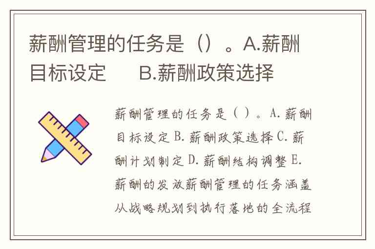 薪酬管理的任务涵盖从战略规划到执行落地的全流程,核心包括设定目标、选择政策、制定计划、调整结构及实施发放五大环节。这些任务相互关联,共同构成支撑企业战略、激励员工效能的完整体系。