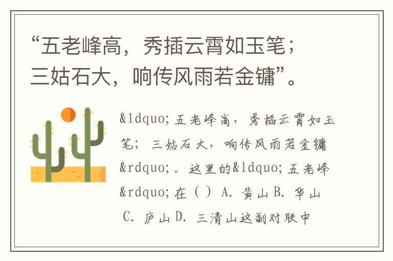 “五老峰高,秀插云霄如玉笔;三姑石大,响传风雨若金镛”。这里的“五老峰”在() A. 黄山 B. 华山 C. 庐山 D. 三清山