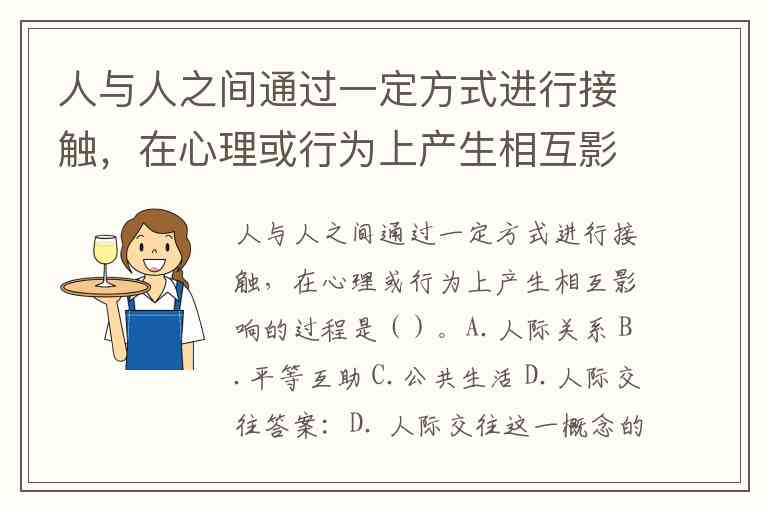 人与人之间通过一定方式进行接触,在心理或行为上产生相互影响的过程是()。A.人际关系 B.平等互助 C.公共生活 D.人际交往