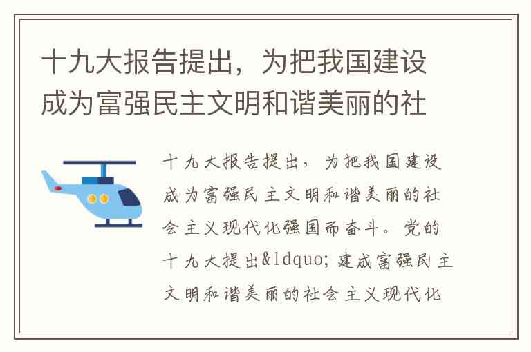 十九大报告提出,为把我国建设成为富强民主文明和谐美丽的社会主义现代化强国而奋斗。