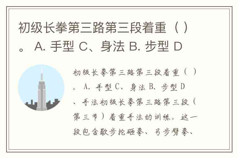 初级长拳第三路第三段着重( )。 A. 手型 C、身法 B. 步型 D、手法