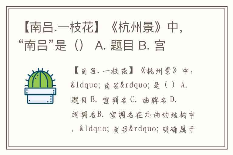 【南吕.一枝花】《杭州景》中,“南吕”是() A. 题目 B. 宫调名 C. 曲牌名 D. 词调名