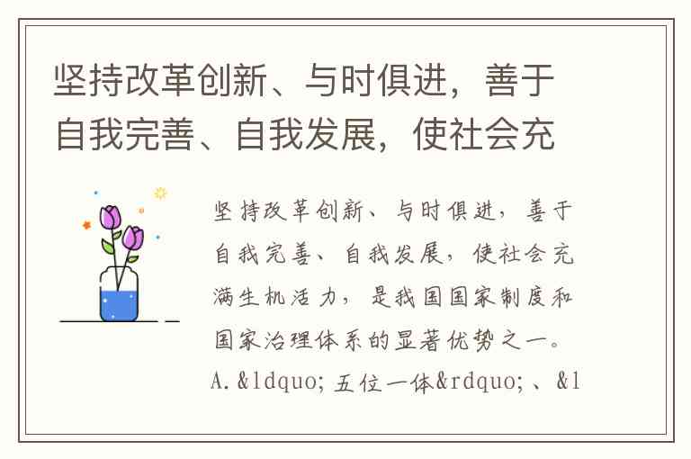 坚持改革创新、与时俱进,善于自我完善、自我发展,使社会充满生机活力,是我国国家制度和国家治理体系的显著优势之一。A.“五位一体”、“四个全面” B.“两个维护”、“四个意识” C.“五位一体”、“四个自信”