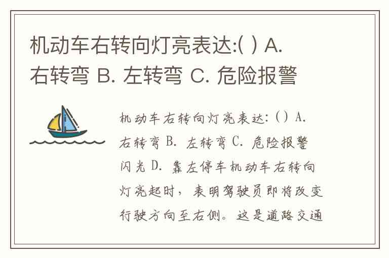 机动车右转向灯亮表达:( ) A. 右转弯 B. 左转弯 C. 危险报警闪光 D. 靠左停车