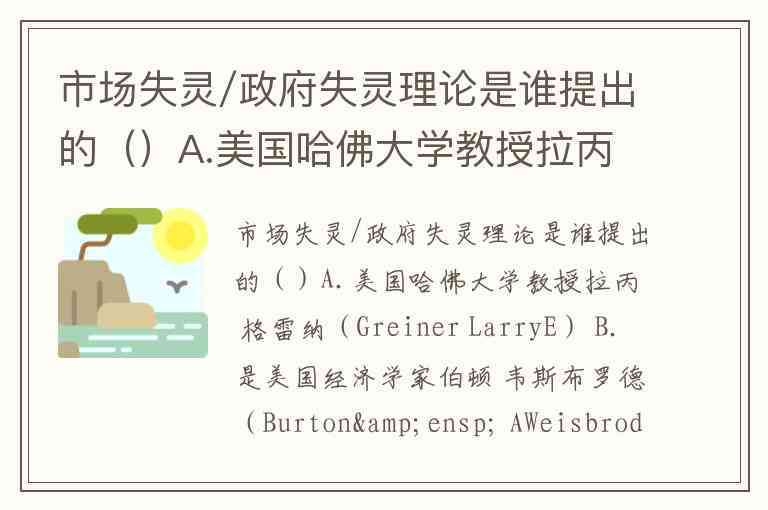 市场失灵/政府失灵理论是谁提出的()A.美国哈佛大学教授拉丙 格雷纳(Greiner LarryE) B.是美国经济学家伯顿 韦斯布罗德(Burton AWeisbrod) C.美国法律经济学家亨利 汉斯曼(Henry BHansmann) D.美国公共政策学者、非营利组织研究专家萨拉蒙(Salamon)