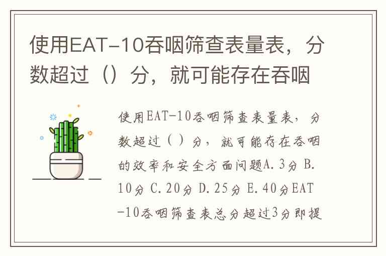 使用EAT-10吞咽筛查表量表,分数超过()分,就可能存在吞咽的效率和安全方面问题A.3分 B.10分 C.20分 D.25分 E.40分