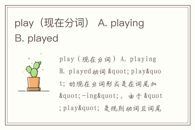 动词 "play" 的现在分词形式是在词尾加 "-ing"。由于 "play" 是规则动词且词尾不是重读闭音节,不需要双写最后一个辅音字母。因此正确答案是 A. playing。