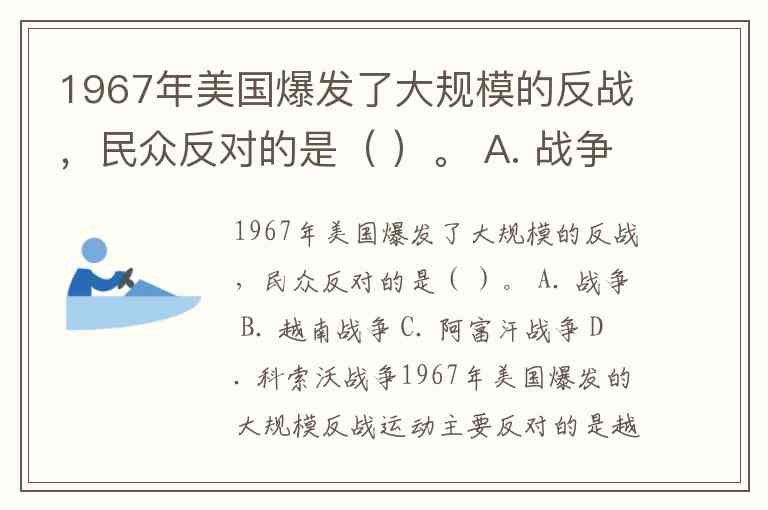 1967年美国爆发了大规模的反战,民众反对的是( )。 A. 战争 B. 越南战争 C. 阿富汗战争 D. 科索沃战争