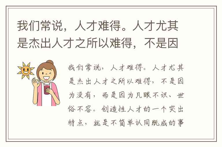 我们常说,人才难得。人才尤其是杰出人才之所以难得,不是因为没有,而是因为凡眼不识、世俗不容。创造性人才的一个突出特点,就是不简单认同既成的事实,不拘泥于固定的想法,具有求异思维和批判精神。他们敢于打破常规,挑战权威,不按常理行事,不按规矩出牌,“扰乱”了现有的秩序,因而不易得到社会的广泛认同,常常被现有秩序的维护者认为是危险人物,加以攻击和扼杀。从古至今,那些改革创新人才常常遭受很多误解和冤屈,大多缘于此因。 关于这段文字,下列说法不正确的是( )。 A. 杰出人才往往比较难得 B. 创造性人才的突出特点是具有批判精神 C. 创造性人才不会被社会所认同 D. 创新人才多有被误解的情况