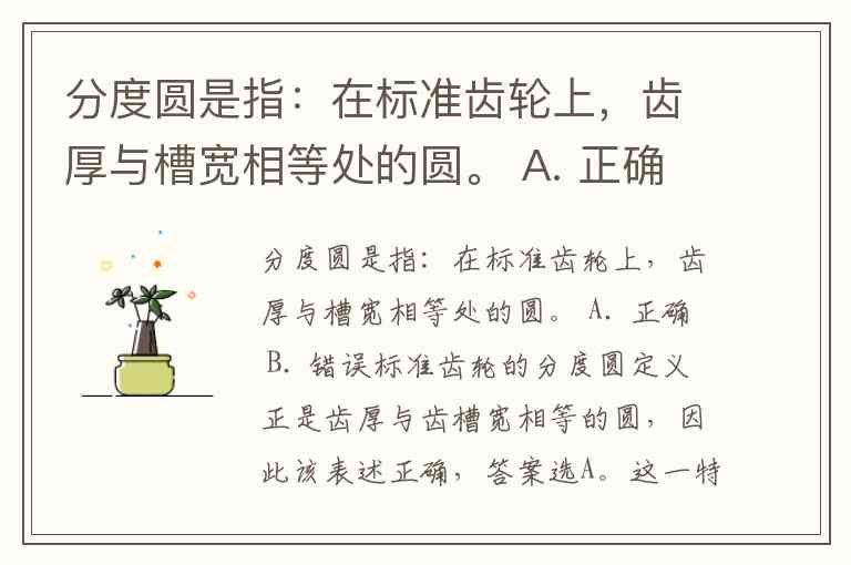 标准齿轮的分度圆定义正是齿厚与齿槽宽相等的圆,因此该表述正确,答案选A。这一特性并非自然形成,而是齿轮设计中人为设定的基准——在分度圆上,齿厚与齿槽宽满足(为模数),确保齿轮参数具有唯一性和可操作性。