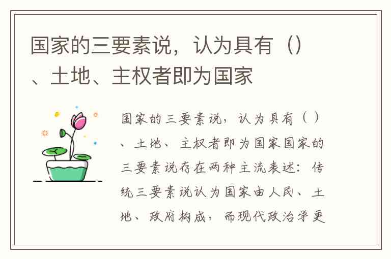国家的三要素说存在两种主流表述:传统三要素说认为国家由人民、土地、政府构成,而现代政治学更倾向于将主权纳入核心要素,形成"领土、人民、主权"的组合。这种差异源于对国家本质的不同侧重——前者强调政治组织形式,后者突出国家的独立属性。