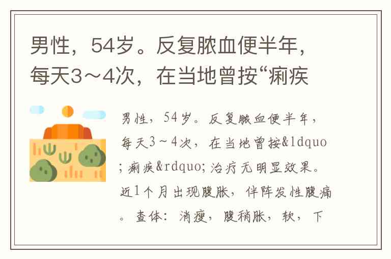 男性,54岁。反复脓血便半年,每天3~4次,在当地曾按“痢疾”治疗无明显效果。近1个月出现腹胀,伴阵发性腹痛。查体:消瘦,腹稍胀,软,下腹轻压痛,右下腹可扪及一肿块,质较硬,尚可活动。首选的辅助检查 A. 纤维结肠镜检查 B. B超 C. 钡餐检查 D. 大便细菌培养 E. CT