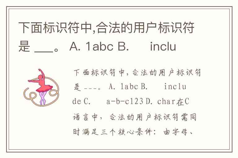 在C语言中,合法的用户标识符需同时满足三个核心条件:由字母、数字和下划线组成,首字符必须是字母或下划线,且不能是关键字。根据这些规则,选项中只有无正确答案。以下是具体分析:
