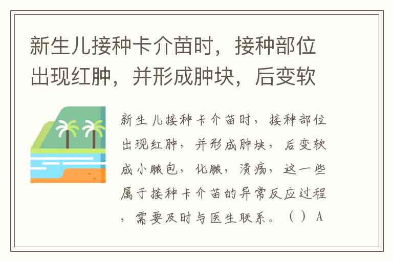 新生儿接种卡介苗时,接种部位出现红肿,并形成肿块,后变软成小脓包,化脓,溃疡,这一些属于接种卡介苗的异常反应过程,需要及时与医生联系。() A. 正确 B. 错误