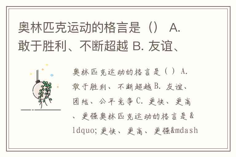 奥林匹克运动的格言是() A. 敢于胜利、不断超越 B. 友谊、团结、公平竞争 C. 更快、更高、更强