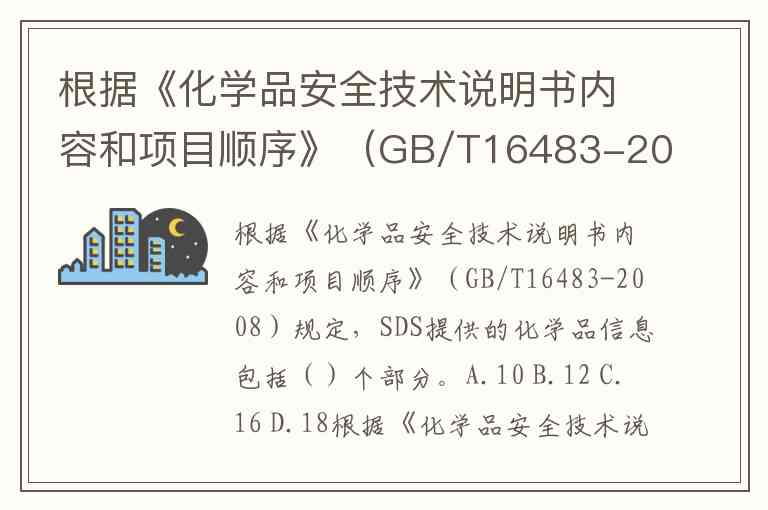 根据《化学品安全技术说明书内容和项目顺序》(GB/T16483-2008)规定,SDS提供的化学品信息包括()个部分。A.10 B.12 C.16 D.18
