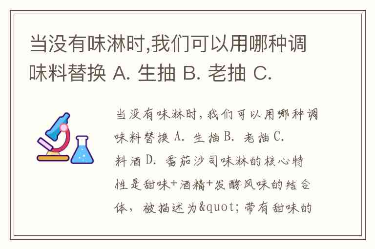 当没有味淋时,我们可以用哪种调味料替换 A. 生抽 B. 老抽 C. 料酒 D. 番茄沙司