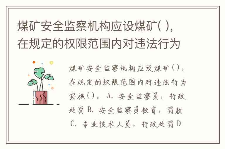 煤矿安全监察机构应设煤矿( ),在规定的权限范围内对违法行为实施( )。 A. 安全监察员,行政处罚 B. 安全监察员教育,罚款 C. 专业技术人员,行政处罚 D. 专业技术人员教育,罚款