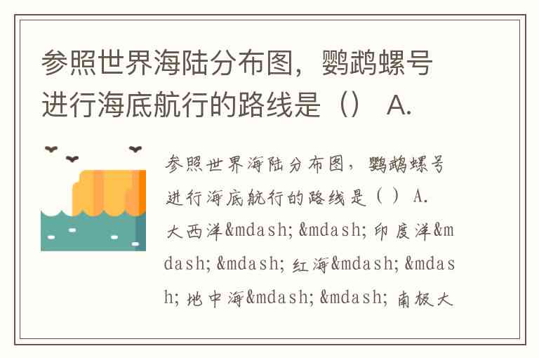 参照世界海陆分布图,鹦鹉螺号进行海底航行的路线是() A. 大西洋——印度洋——红海——地中海——南极大陆——太平洋 B. 印度洋——地中海——大西洋——红海——南极大陆——太平洋 C. 太平洋——红海——地中海——大西洋——南极大陆——印度洋 D. 太平洋——印度洋——红海——地中海——南极大陆——大西洋