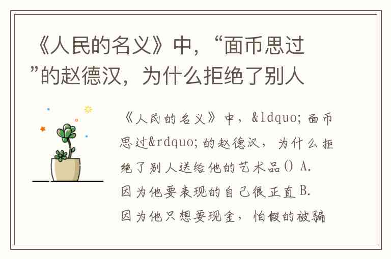《人民的名义》中,“面币思过”的赵德汉,为什么拒绝了别人送给他的艺术品() A. 因为他要表现的自己很正直 B. 因为他只想要现金,怕假的被骗 C. 因为他不喜欢艺术品 D. 因为他觉得艺术品不值钱