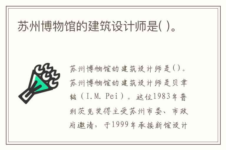 苏州博物馆的建筑设计师是贝聿铭(I.M. Pei)。这位1983年普利茨克奖得主受苏州市委、市政府邀请,于1999年承接新馆设计,2006年10月项目正式落成开放[document id="1"]。作为贝聿铭晚年"封刀之作",这座建筑将现代主义几何美学与苏州传统园林意境融为一体,其设计灵感直接源于他童年生活过的狮子林,以及文徵明设计的拙政园紫藤、米芾山水画等江南文化元素。