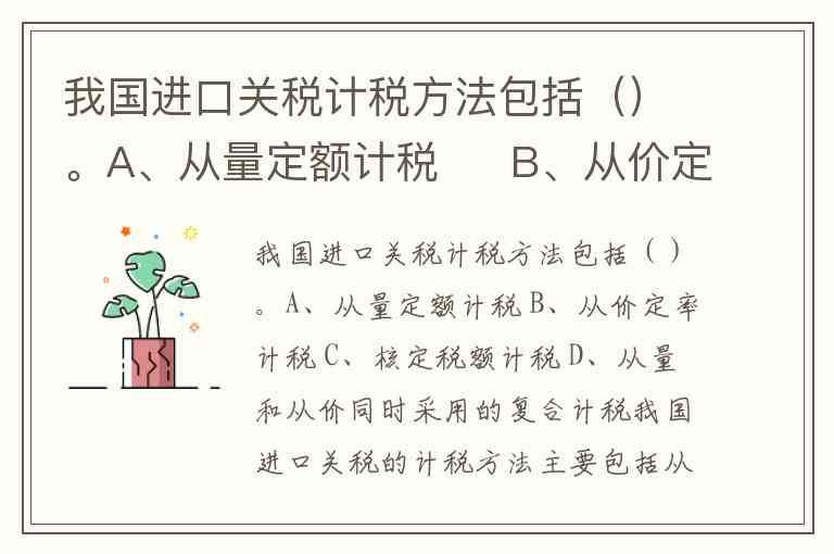 我国进口关税计税方法包括()。A、从量定额计税 B、从价定率计税 C、核定税额计税 D、从量和从价同时采用的复合计税