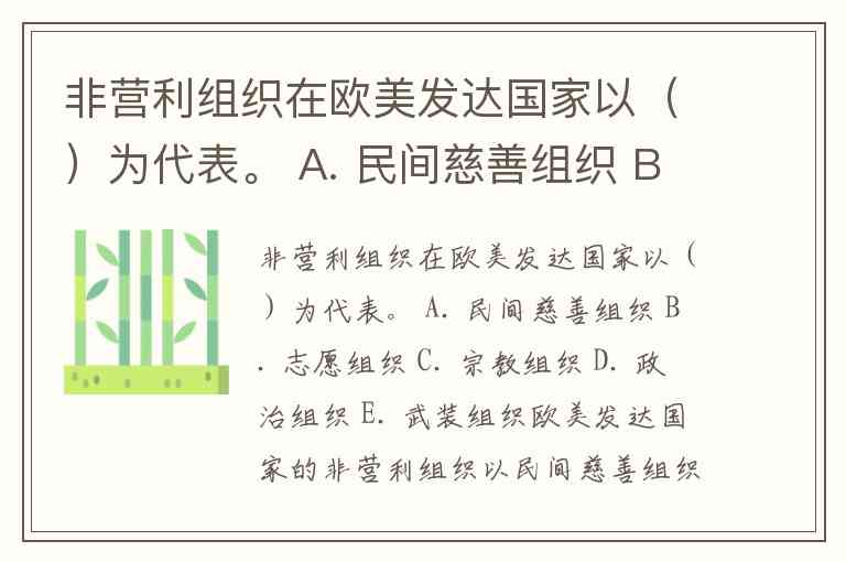 非营利组织在欧美发达国家以()为代表。 A. 民间慈善组织 B. 志愿组织 C. 宗教组织 D. 政治组织 E. 武装组织