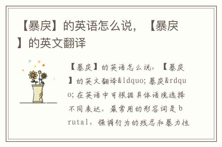 “暴戾”在英语中可根据具体语境选择不同表达。最常用的形容词是 brutal,强调行为的残忍和暴力性,如描述“暴戾成性”的人可译为"a brutal person by nature"。