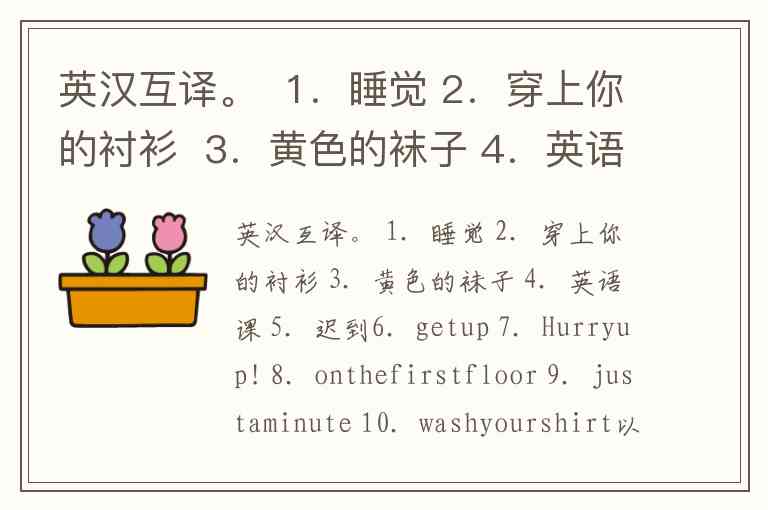 英汉互译。 1.睡觉 2.穿上你的衬衫 3.黄色的袜子 4.英语课 5.迟到6.getup 7.Hurryup! 8.onthefirstfloor 9.justaminute 10.washyourshirt