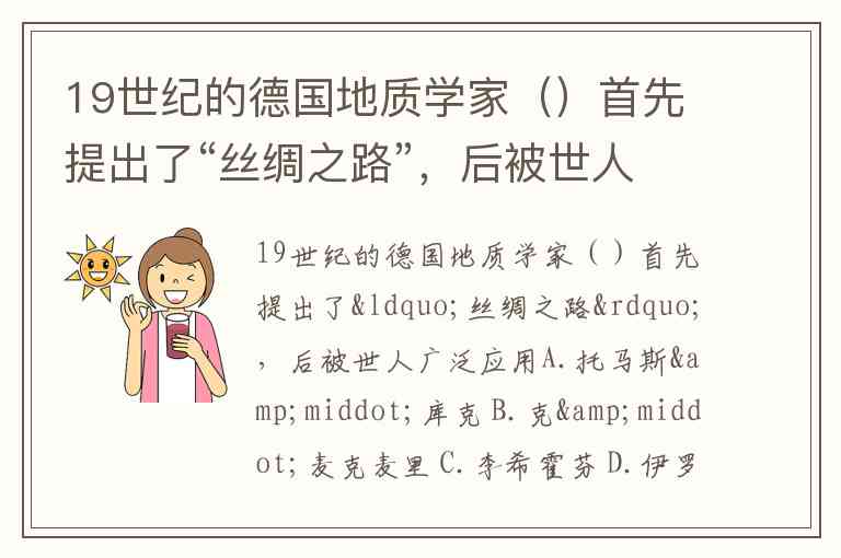 19世纪的德国地质学家()首先提出了“丝绸之路”,后被世人广泛应用A.托马斯·库克 B.克·麦克麦里 C.李希霍芬 D.伊罗·艾·沃尔夫