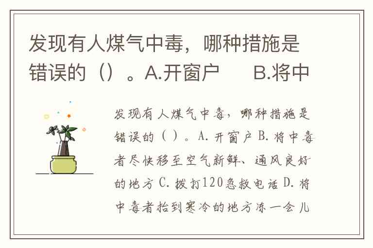 发现有人煤气中毒,哪种措施是错误的()。A.开窗户 B.将中毒者尽快移至空气新鲜、通风良好的地方 C.拨打120急救电话 D.将中毒者抬到寒冷的地方冻一会儿并灌醋